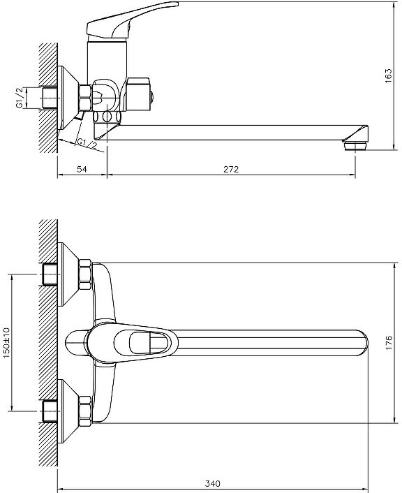 Смеситель на раковину настенный Эверест B46-350 с круглым поворотным изливом, кран-буксы 1/2", хром