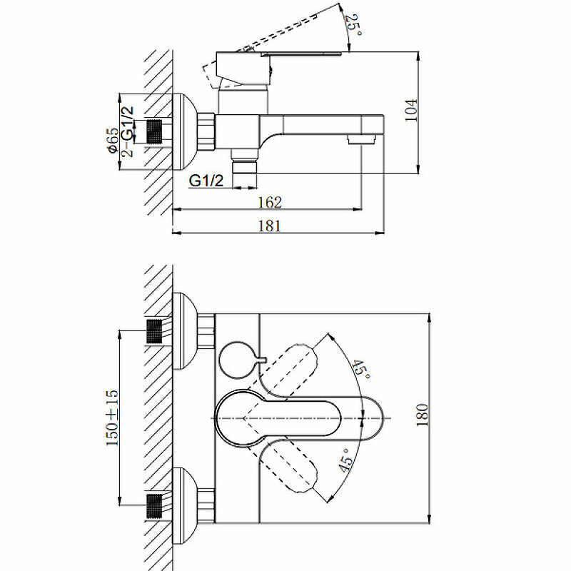 Смеситель на раковину настенный Эверест B46-350 с круглым поворотным изливом, кран-буксы 1/2", хром