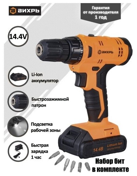 Дрель-шуруповёрт аккумуляторная вихрь ДА-14,4Л-2 1 АКБ и ЗУ в комплекте информация: