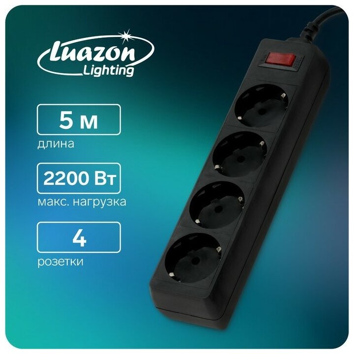 Luazon Lighting Сетевой фильтр Luazon Lighting, 4 розетки, 5 м, 2200 Вт, 3 х 0.75 мм2, 10 А, 220 В, черный информация: