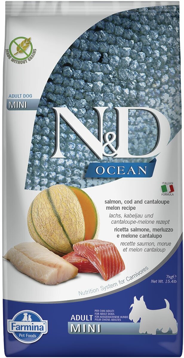 10 цен на Farmina N&D Ocean Dog Salmon, Codfish & Cantaloupe Melon Adult Mini сухой беззерновой корм для взрослых собак мелких пород с лососем, треской и дыней - 7 кг