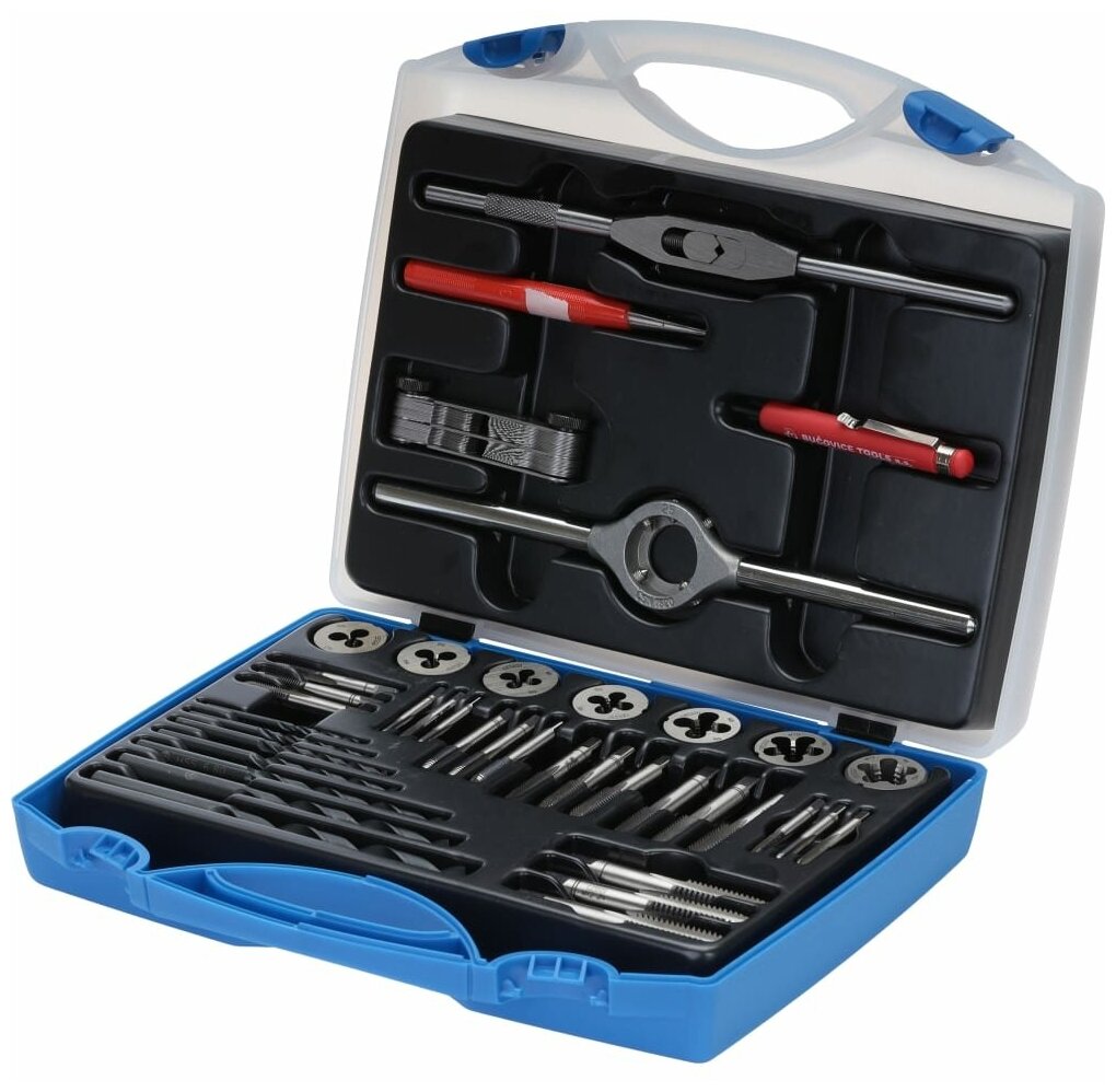 Резьбонарезной набор M 3, 39 пр, M3-M12, метчики+плашки+воротки+сверла+резьбомер+керн+отвертка в пластиковом кейсе Bucovice Tools 330120