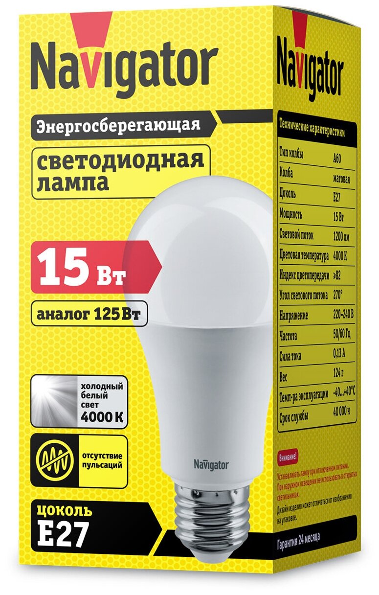 Лампа светодиодная 71 365 NLL-A60-15-230-4K-E27. 71365 Navigator (2шт.) информация: