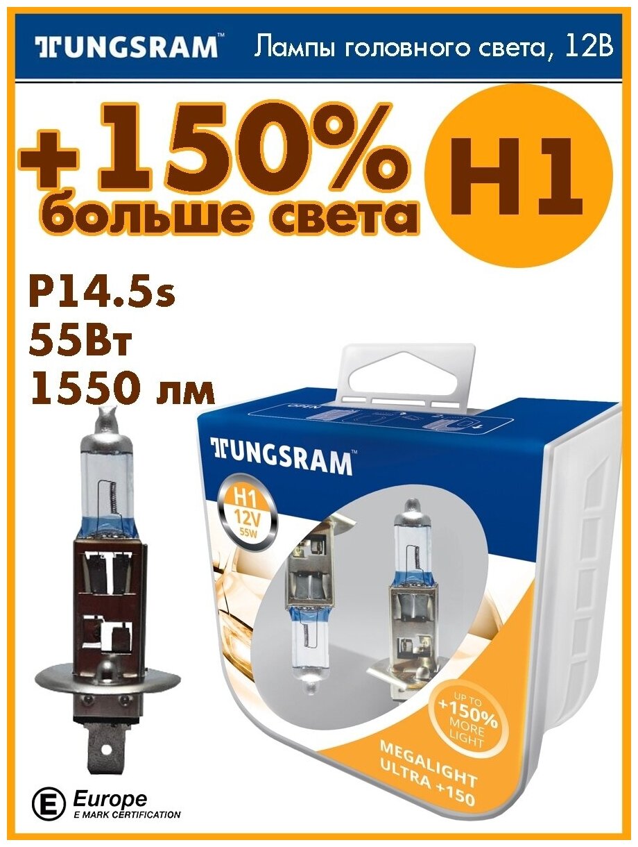 Лампы TUNGSRAM "Megalight Ultra +150", H1, +150%, 12V, 55W, P14,5s, 3200K, комплект 2 шт. информация: