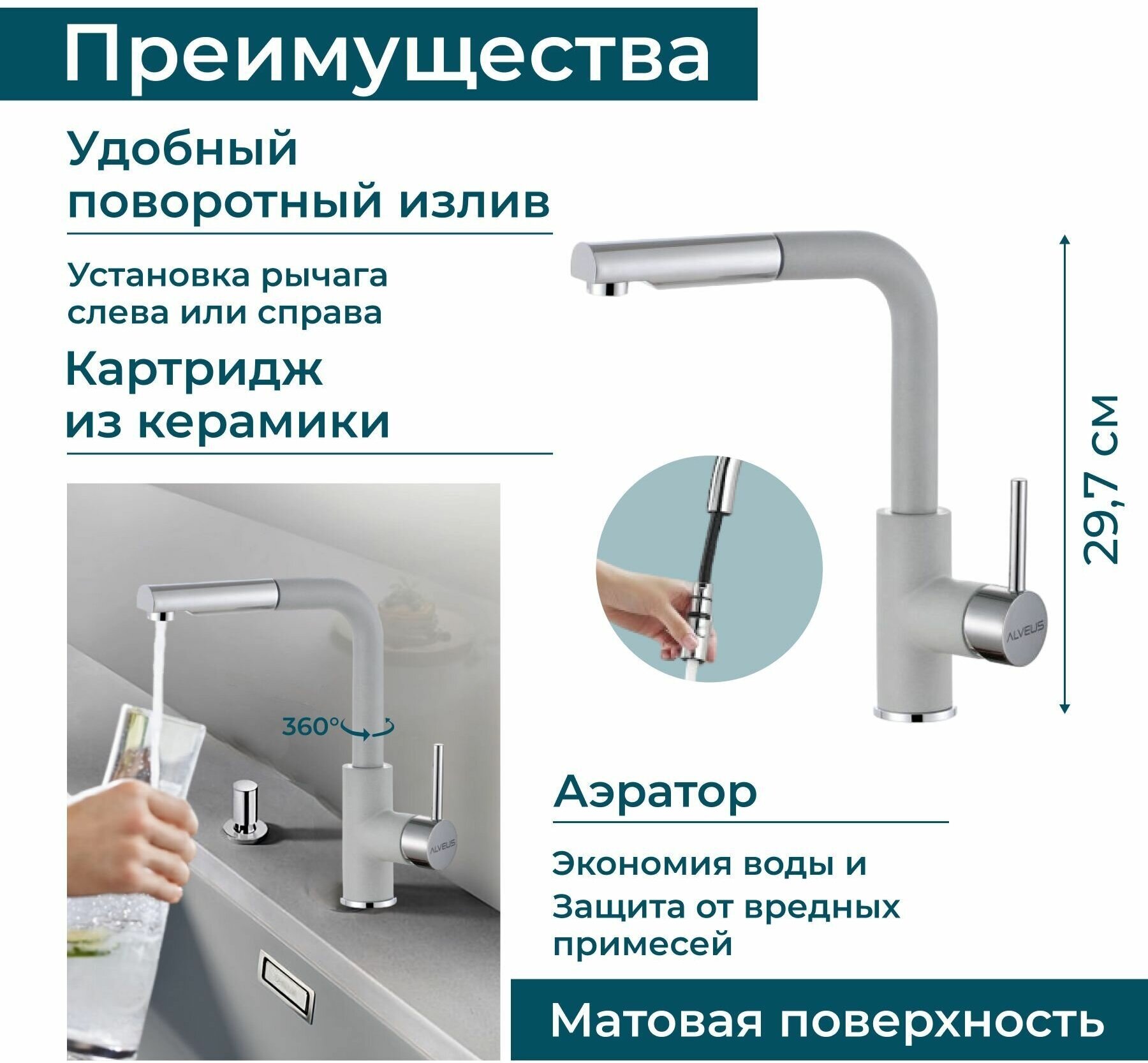 Отзывы на Смеситель для кухни с выдвижным, высоким, поворотным изливом ALVEUS SIROS - P G81 CONCRETE матовый серый
