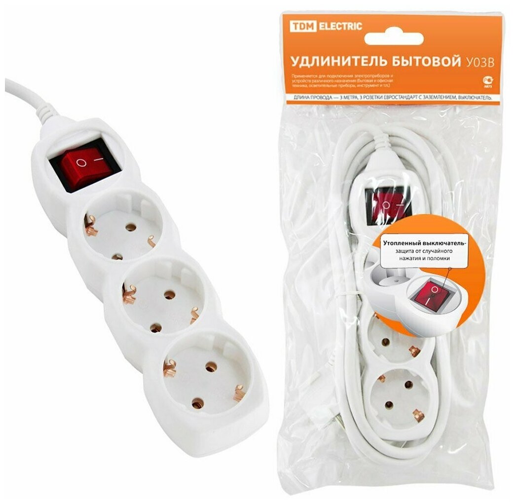 10 цен на Удлинитель TDM У03В 3 гнезда 3метров с заземляющими контактами с выключателем ПВС 3х1 SQ1303-0101, (1 шт.)