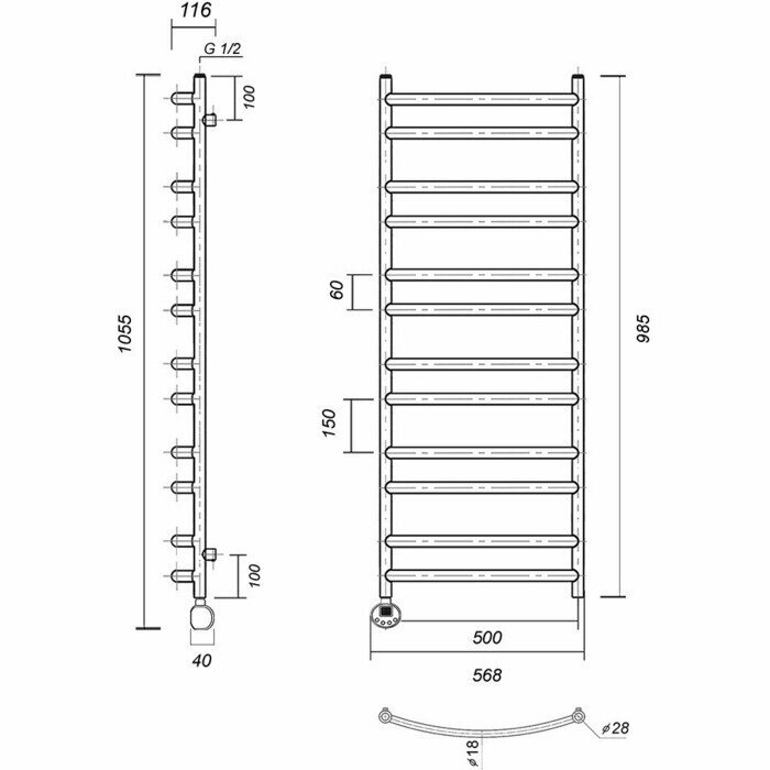 Полотенцесушитель электрический Domoterm Калипсо П12 500х985 АБР EL слева информация: