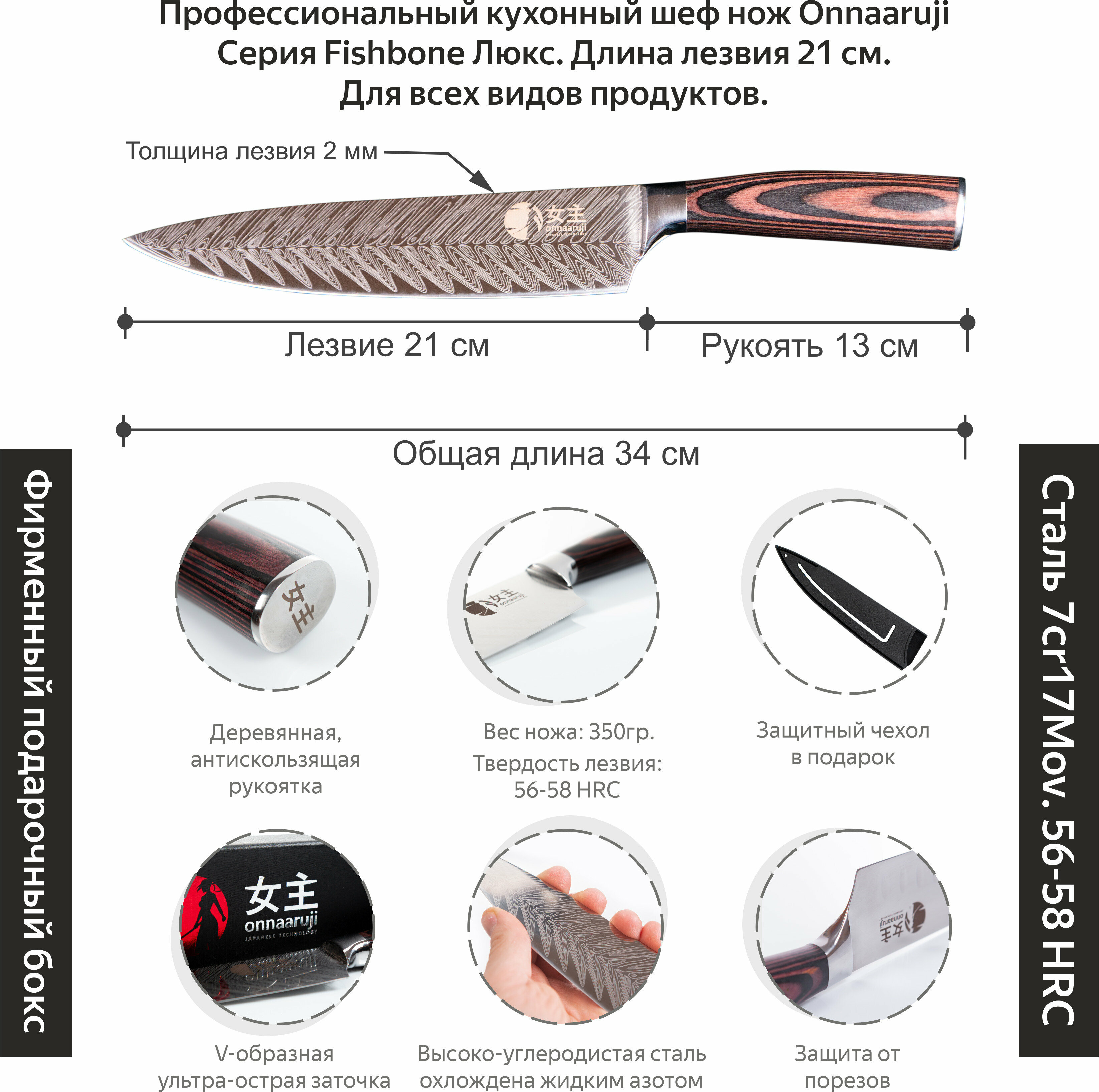 Нож кухонный, универсальный, поварской, шеф нож Onnaaruji. Профессиональный. Длина лезвия 21 см. FishBones серия информация:
