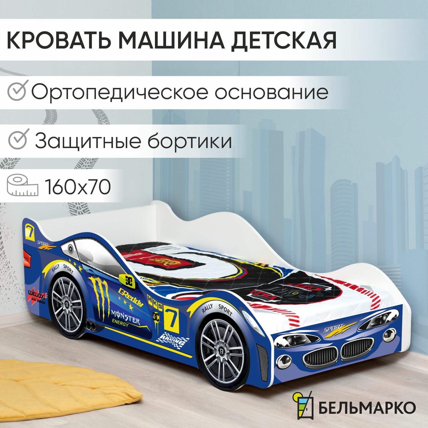 Детская кровать машина Бельмарко Вихрь с ортопедическим основанием и бортиком