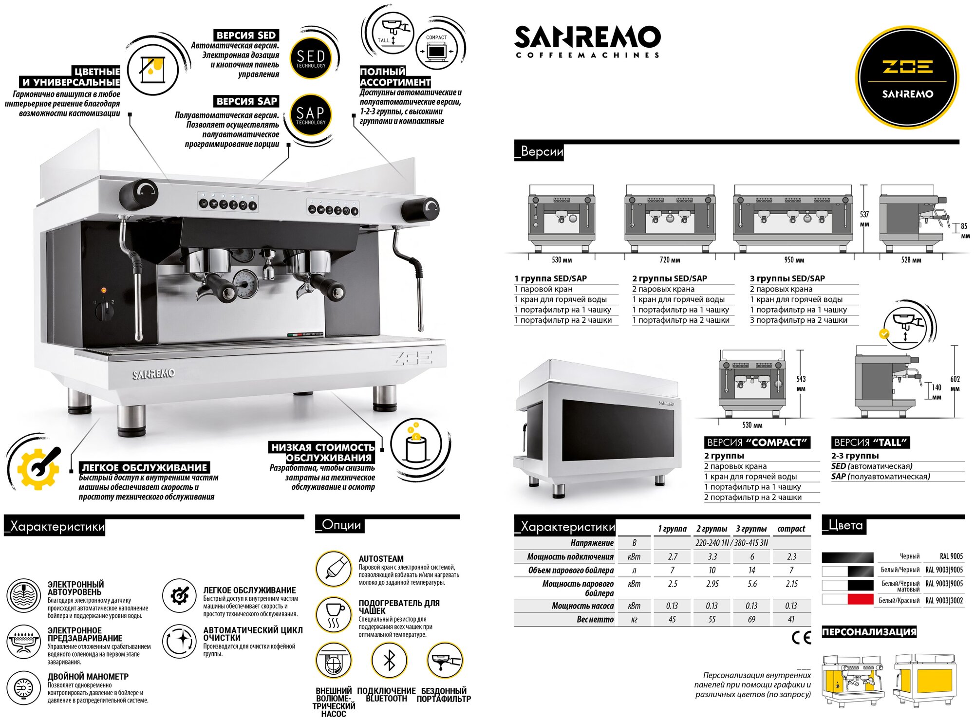 10 цен на Кофемашина рожковая профессиональная полуавтомат для дома и кофейни Sanremo ZOE 2 SAP, 2 группы, черная