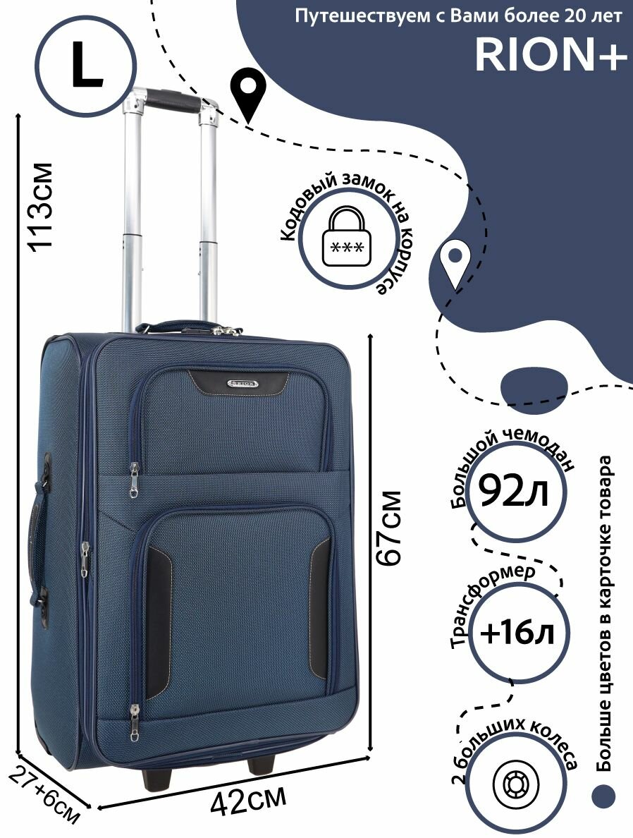 Чемодан Рион+ (RION+) R407, Ткань, 68 см, 72 литра, 2 колеса, L (70-100 см), трансформер +19 литров, усиленный до 25кг, синий информация: