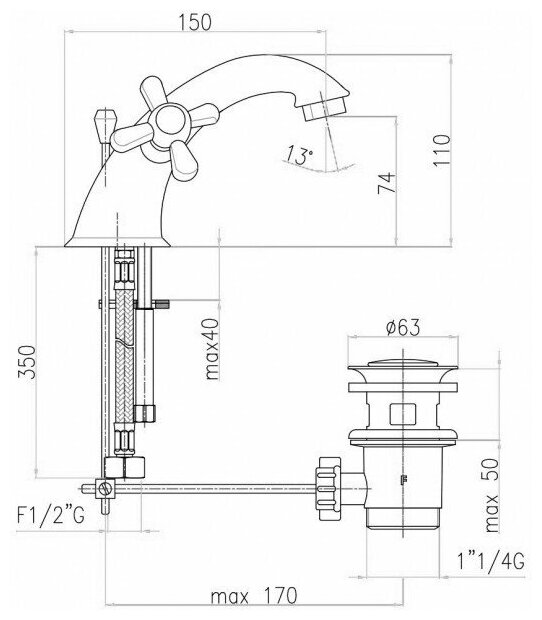 Смеситель на раковину настенный Эверест B46-350 с круглым поворотным изливом, кран-буксы 1/2", хром