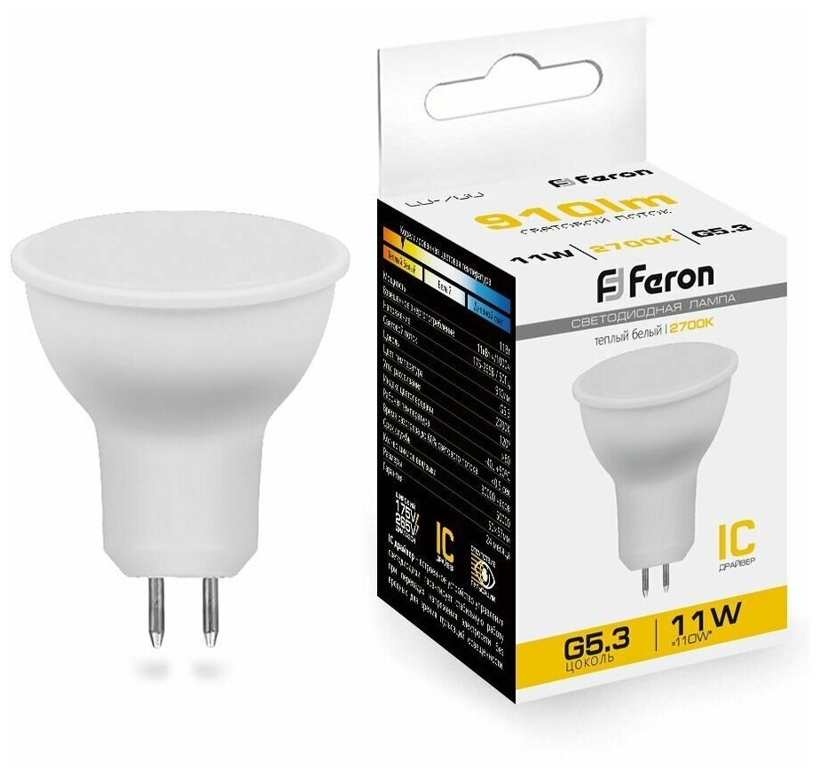 Лампочка светодиодная Feron 11W=110W 170-265V GU5.3 Спот MR16 910Лм Ra>80 угол 120° 2700К, упаковка 10шт. информация: