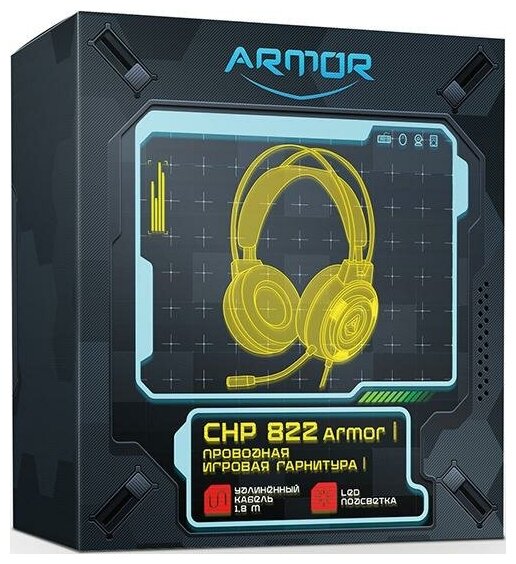 Cbr CHP 822 Armor, Компьютерная гарнитура проводная стерео, игровая, полноразм. наушники, микрофон с шумоподав., USB 2хмини-джек 3,5 мм, LED-подсветка, эргоном. дизайн, длина каб. 1,8 м, цвет чёрный информация: