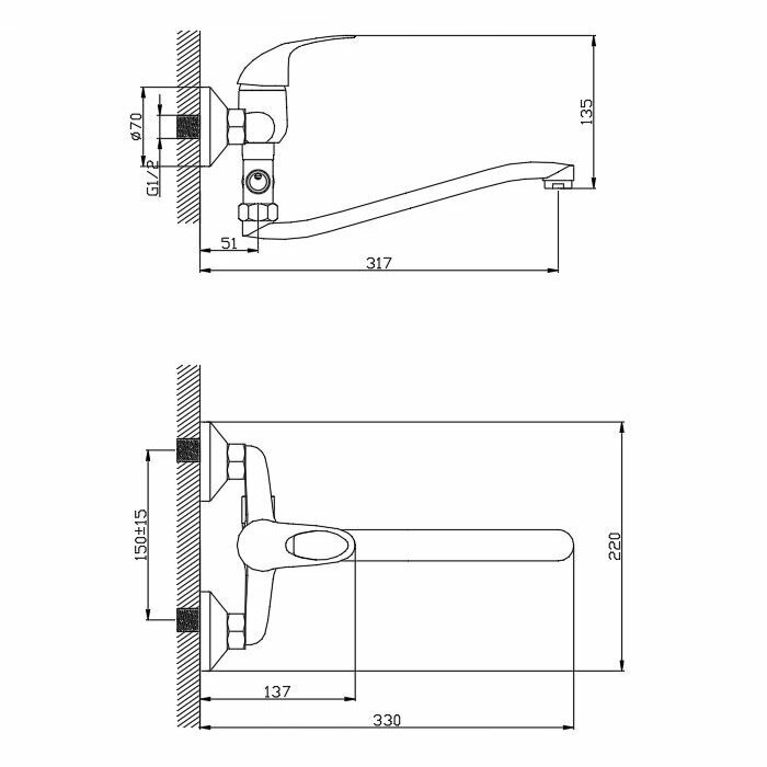 Смеситель на раковину настенный Эверест B46-350 с круглым поворотным изливом, кран-буксы 1/2", хром