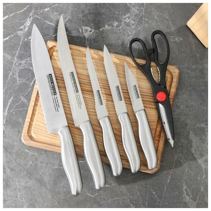 10 цен на --- Набор на подставке "Блеск стали", 6 предметов: 5 ножей лезвие 9,5 см, 13 см, 13,5 см, 20,5 см, 20,5 см, ножницы
