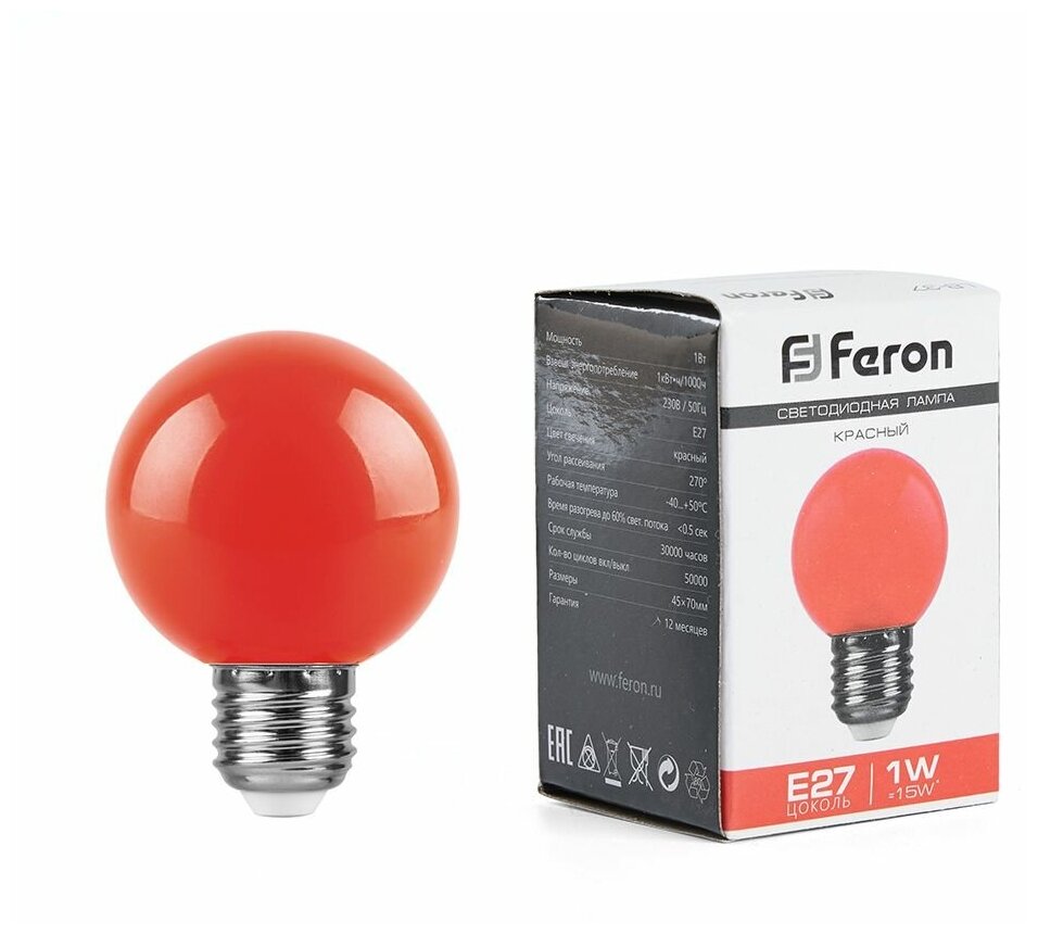 Feron Лампа св/д шар G45 E27 1W красный матовая 70x45 д/гирлянды Белт Лайт LB-37 25116 информация: