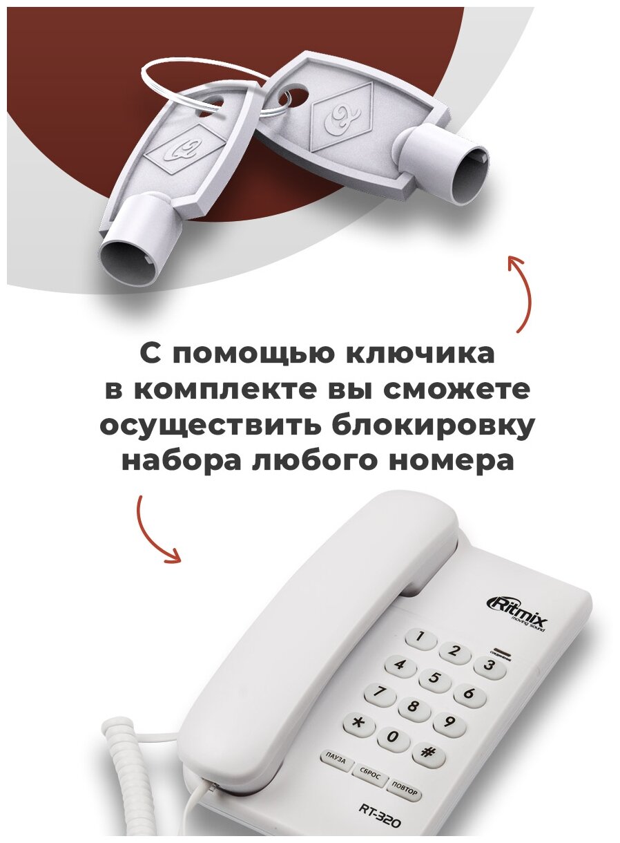 Телефон RITMIX RT-320 white, световая индикация звонка, блокировка набора ключом, белый, 15118348 1 340 ₽
