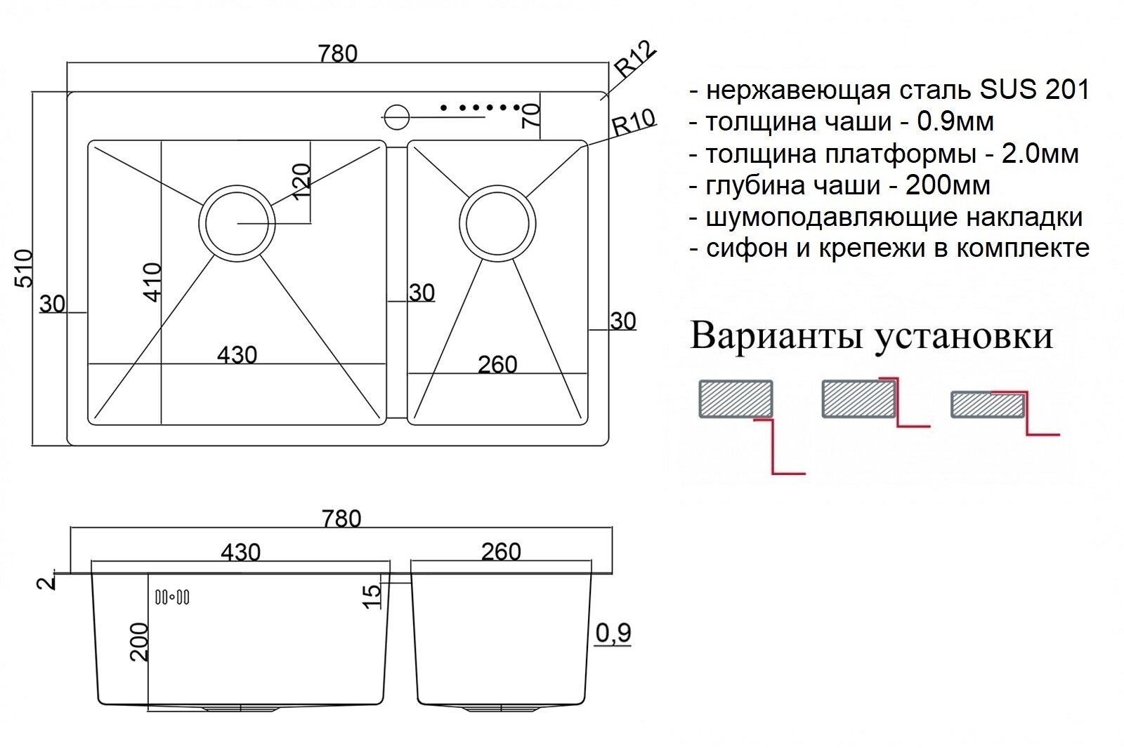 Мойка кухонная ZorG серия STEEL HAMMER SH 78-2-51-L GRAFIT графит черная, две чаши, большая слева информация: