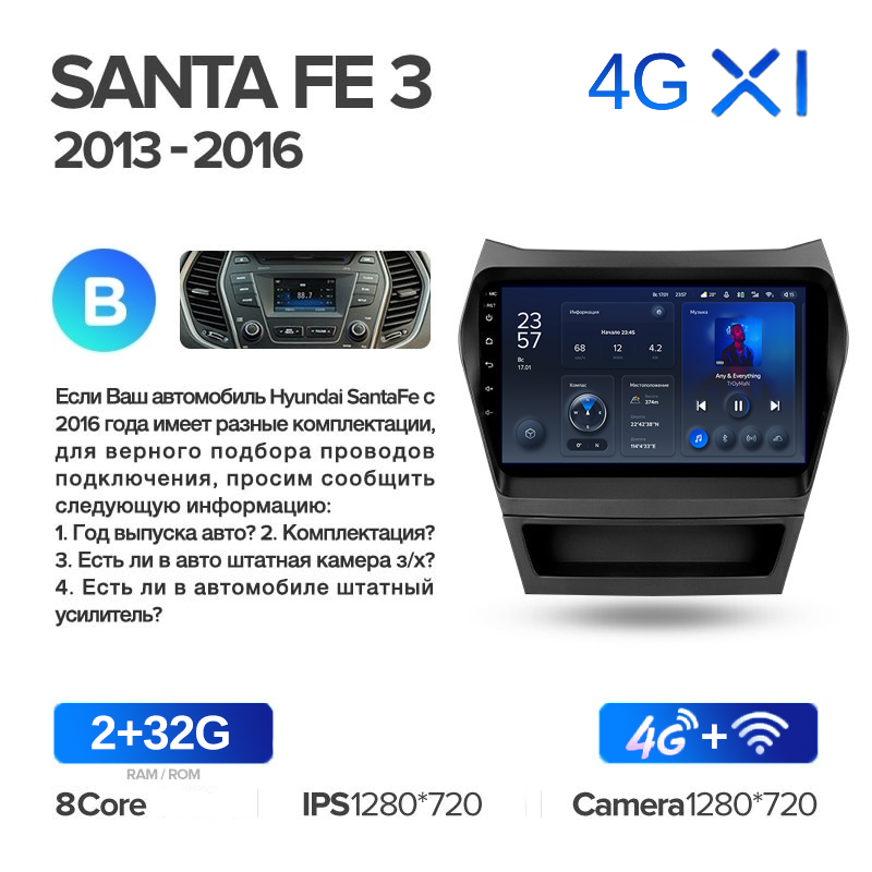 Штатная магнитола Teyes X1 Wi-Fi + 4G Hyundai Santa Fe 3 2013-2016 информация: