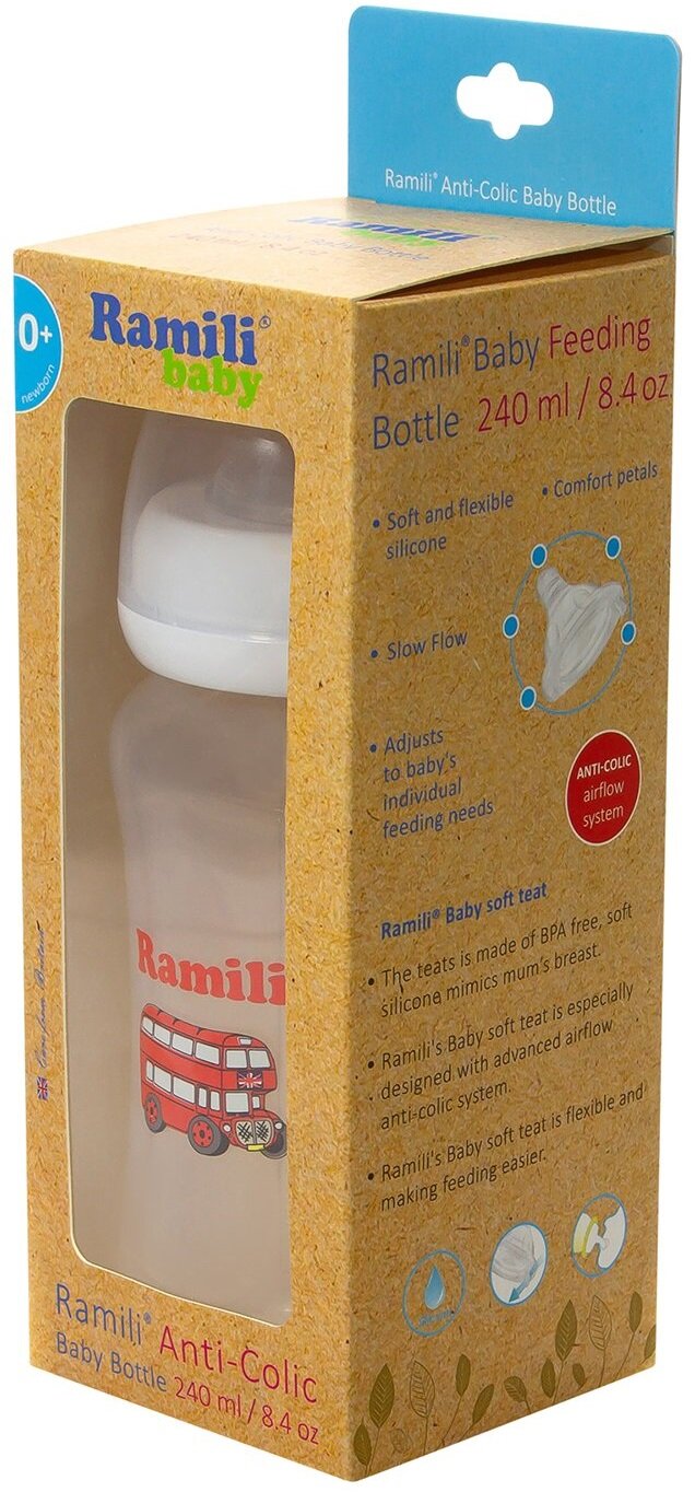 Противоколиковая бутылочка для кормления Ramili Baby (240 мл, 0+, слабый поток)