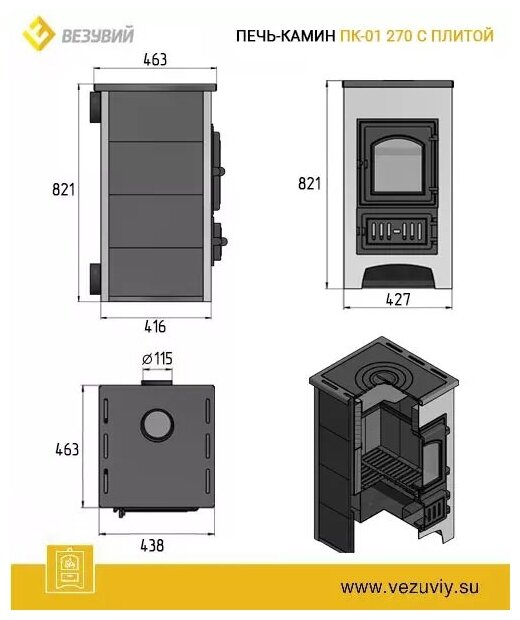 Печь-Камин везувий ПК-01 (270) с плитой красн. 9 кВт (150 м3) 115 мм 33 340 ₽