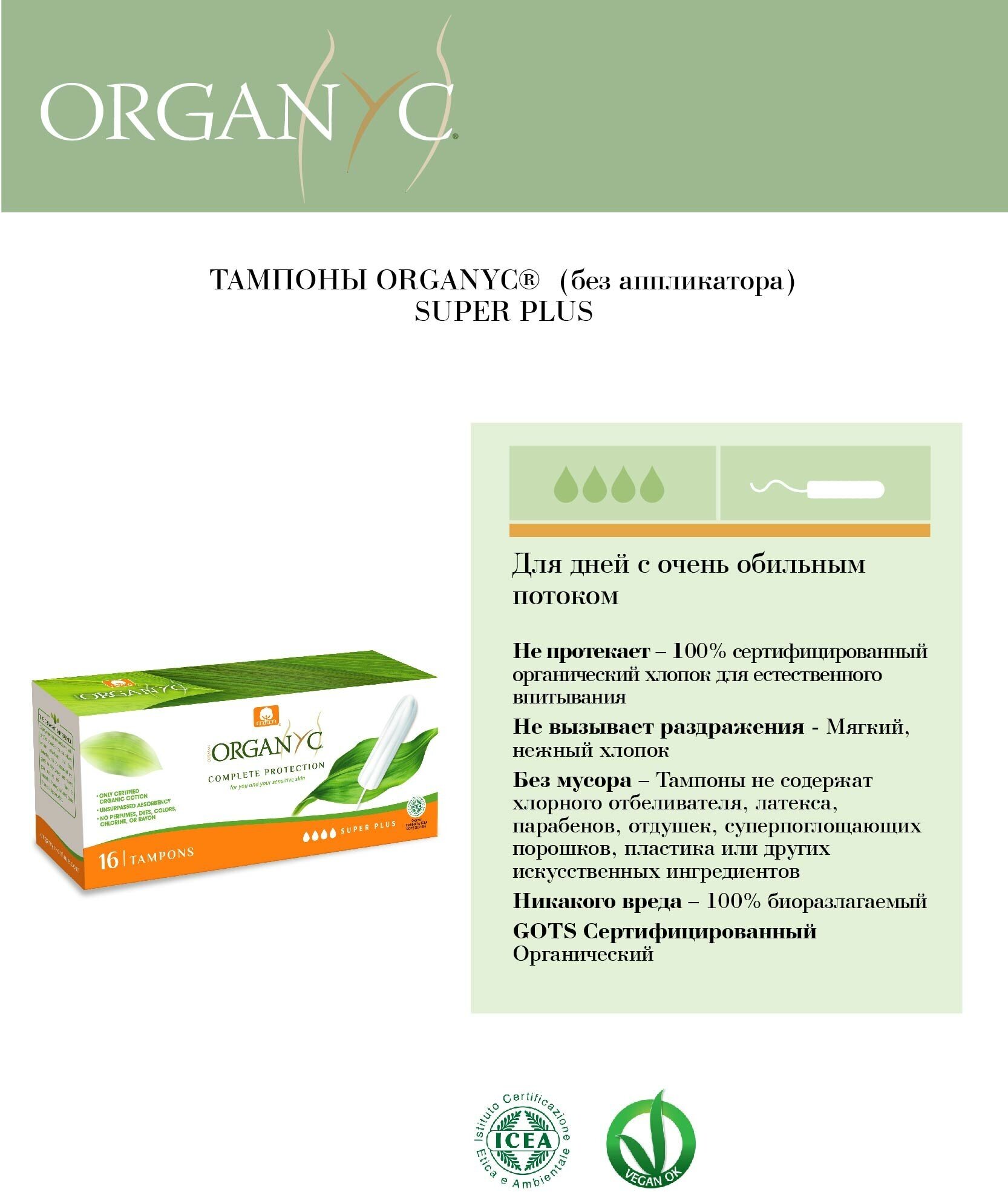 Тампоны Супер плюс, без аппликатора. Organyc 16шт., 4 капли информация: