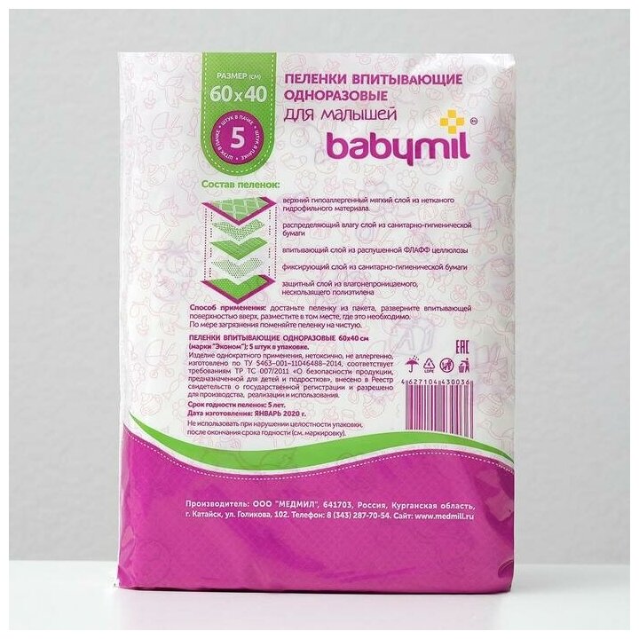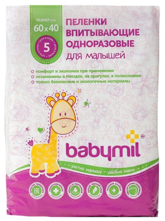 Babymil Пеленка впитывающая одноразовая 60*40, 5 шт, Babymil информация:
