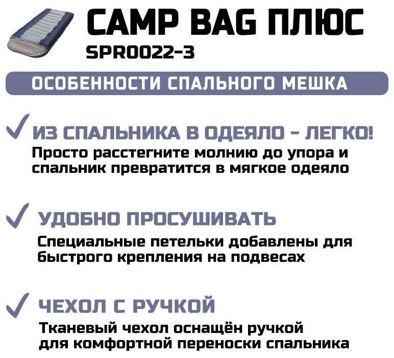 10 цен на Спальный мешок одеяло Prival Camp bag плюс синий/серый, t extr -5 °С, 220х95, молния справа