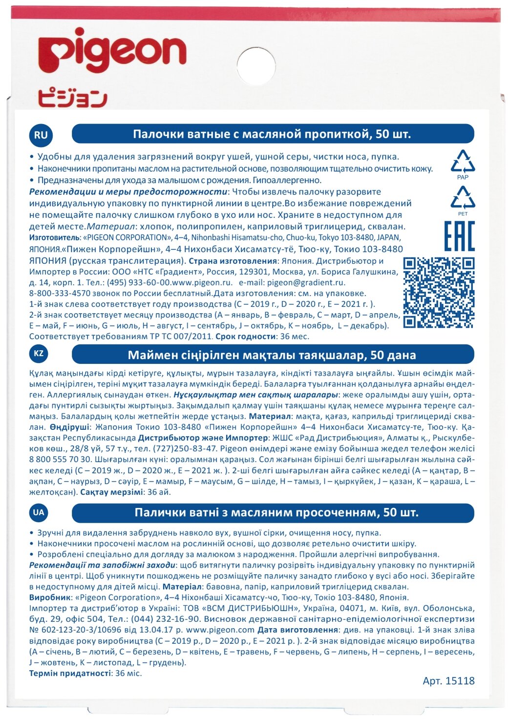 Ватные палочки Pigeon с масляной пропиткой в индивидуальной упаковке, 50 шт. информация: