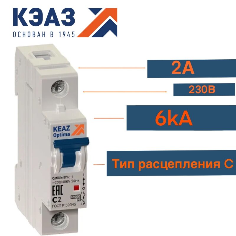 Выключатель автоматический модульный 1п C 2А 6кА OptiDin BM63-1C2-УХЛ3 КЭАЗ 260507 (1 шт.)
