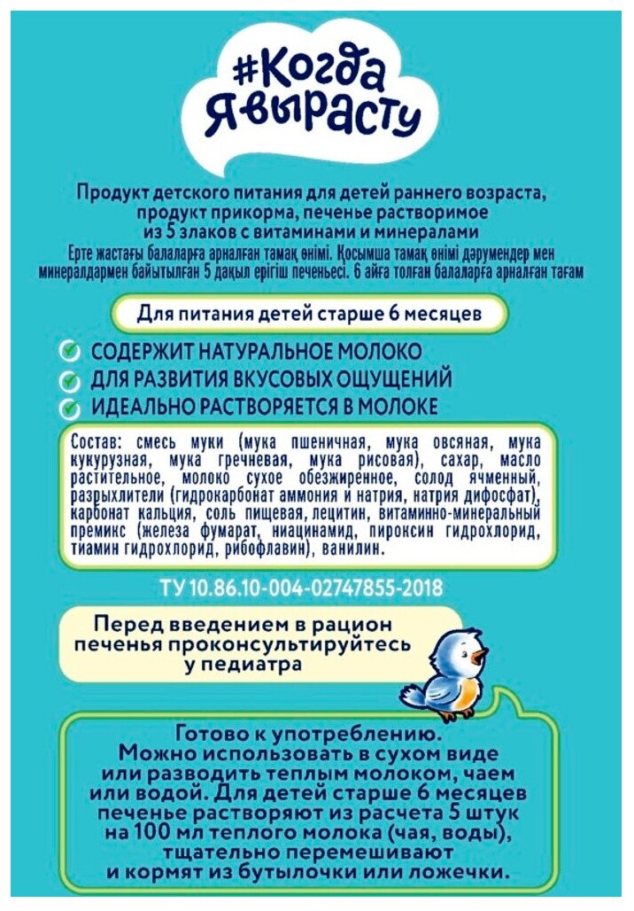 Когда Я вырасту Печенье детское, 5 злаков с витаминами и минералами, растворимое, с 6 мес.,35г.Х8 информация: