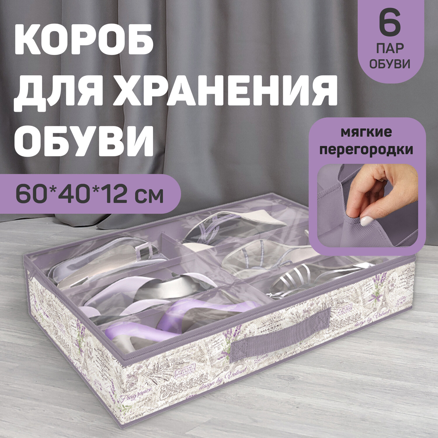 10 цен на VAL LV-S6 Кофр для хранения обуви, 6 секций, 60*40*12 см, LAVANDE, шт