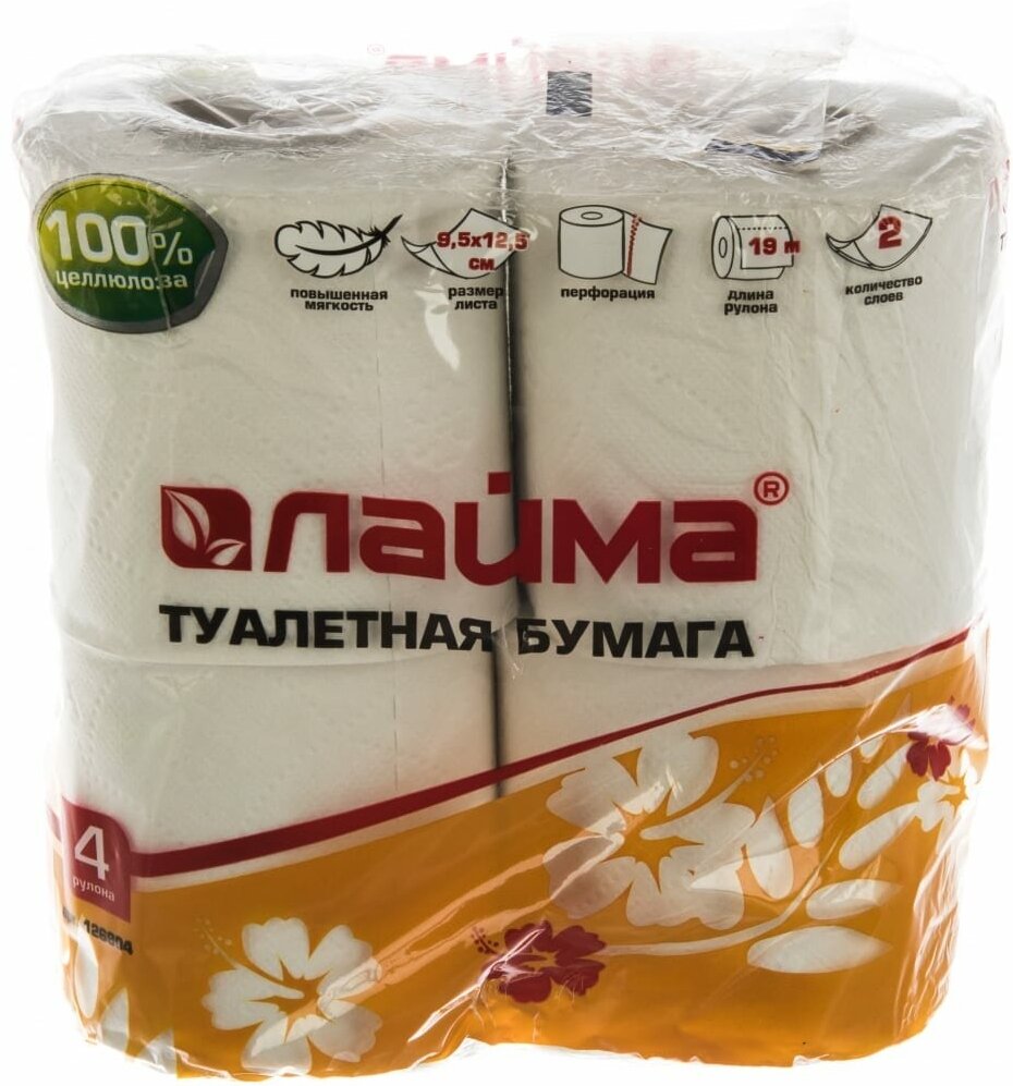 Бумага туалетная Лайма 4 шт, 2-х слойная, 4х19 м, белая (126904)