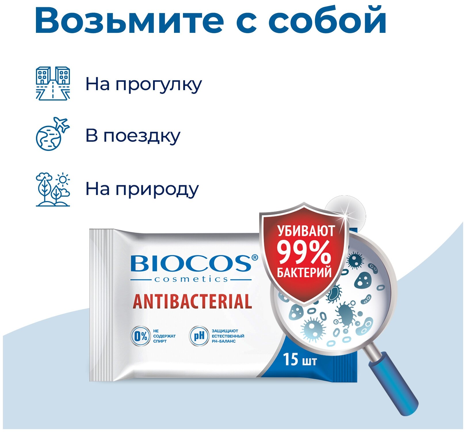 "BioCos Антибактериальные влажные салфетки", 15 штук