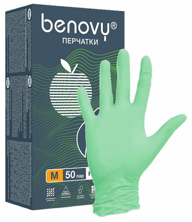 Перчатки нитриловые смотровые Benovy зеленые (50 пар, M) 339 ₽