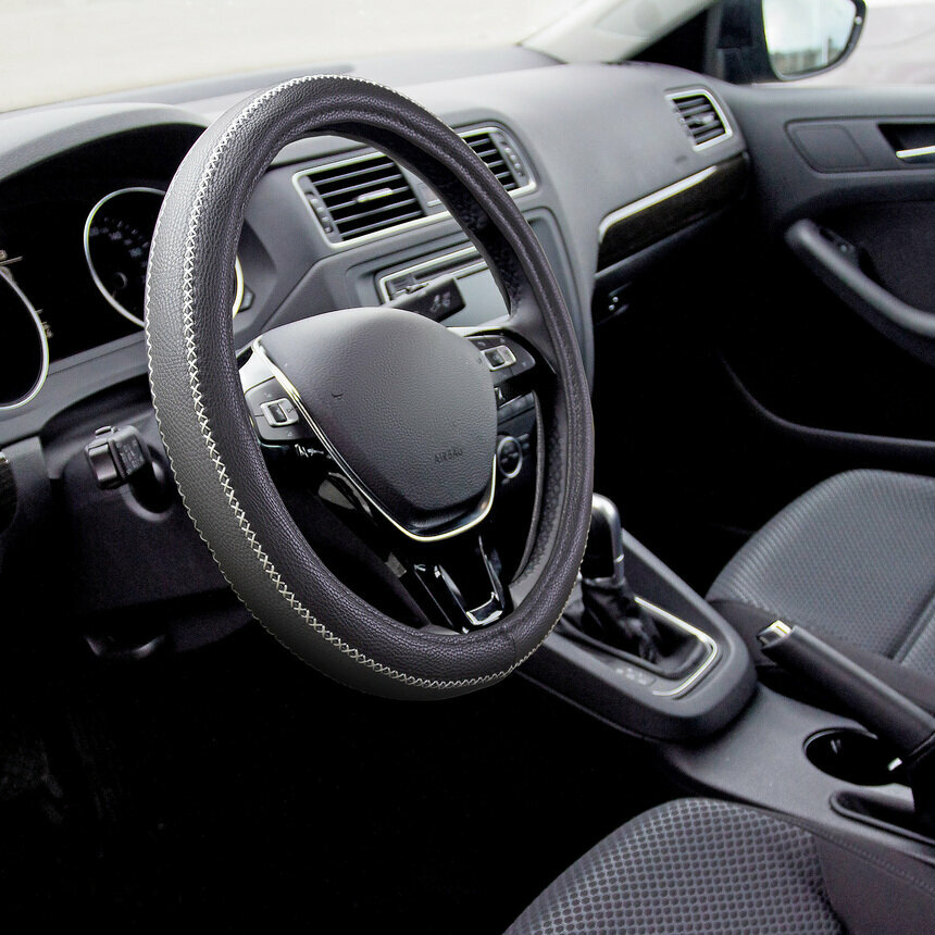 Оплетка на руль AUTOPROFI M 38см экокожа, прострочка по ободу, в цвет, черно-серая
