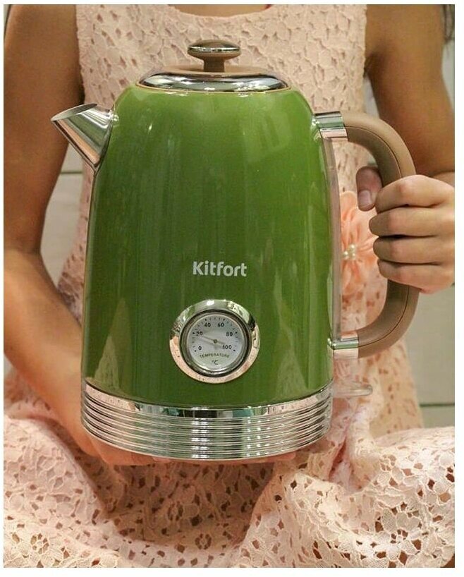 Чайник KITFORT КТ-6110, 1,7 л, 2200 Вт, закрытый нагревательный элемент, сталь, зеленый/бежевый