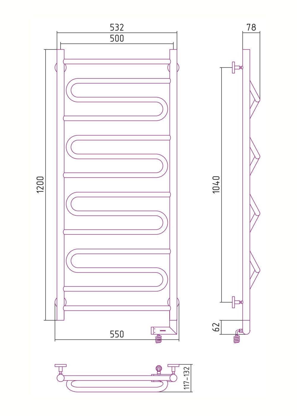 TERMINUS Полотенцесушитель электрический Terminus Хендрикс П6 500x596, ТЭН HT-1 300W, левый/правый