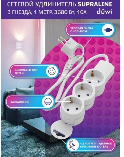 Удлинитель бытовой duwi Supraline с заземлением 3 розетки 1 метр провод H05VV-F 3х1,0мм2 3680 Вт 16А защитные шторки от доступа детей