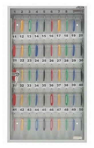 | Комплектация | Количество крючков для ключей - 50 шт. В комплект ключниц входят пластиковые цветные брелоки, рассчитанные на количество ключей и самоклеящиеся номерки. |