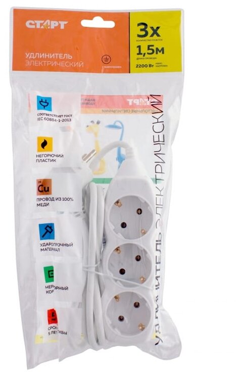 Отзывы на Удлинитель Старт S 3x1-Z, с заземлением, 3 розетки евро, 1,5 м, белый