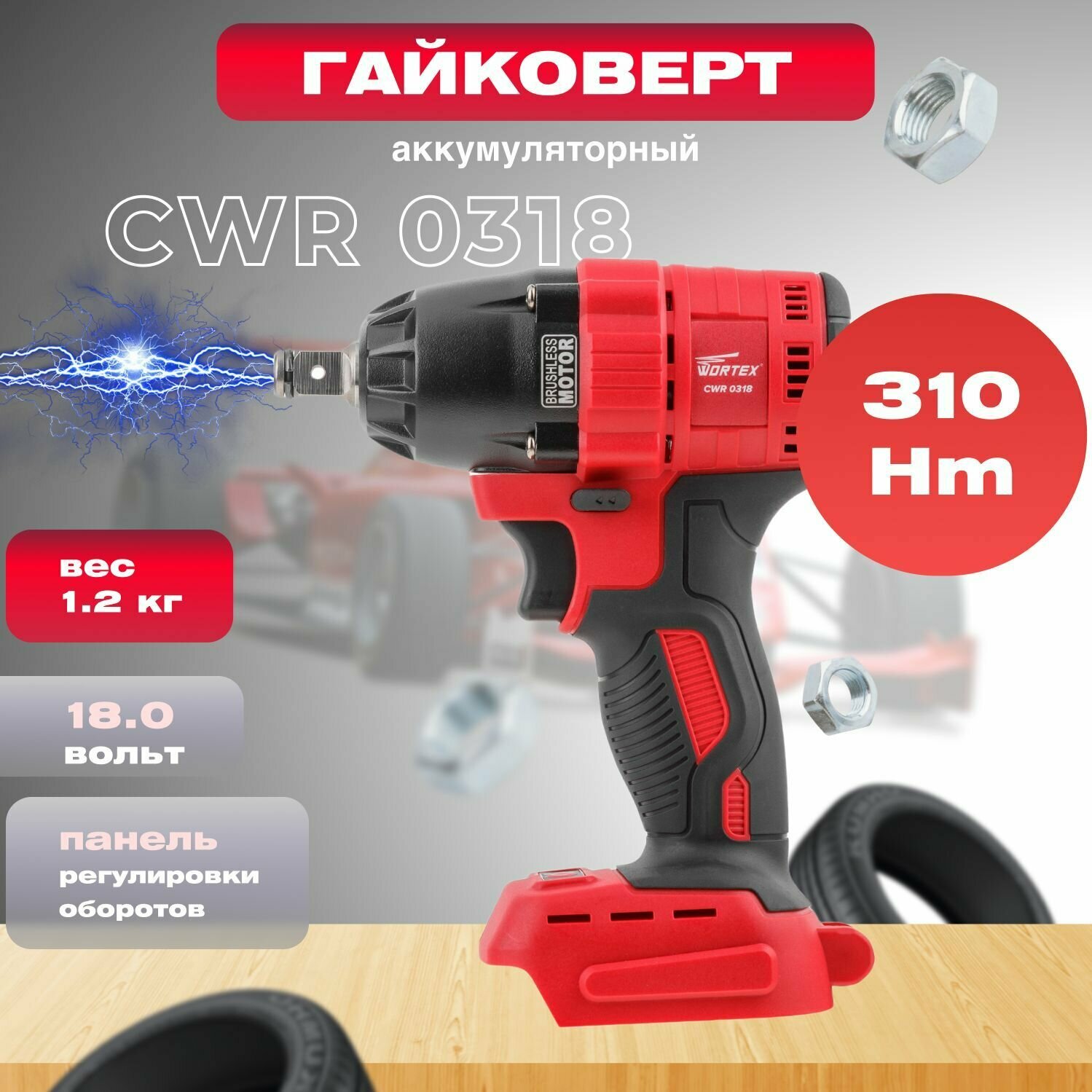 Аккум. ударный гайковерт WORTEX CWR 0318 в кор. ALL1 (18.0 В, без аккумулятора И ЗУ, посадочн. квадрат 1/2 ", 310 Нм, вес 2.0 кг) (CWR031800029)