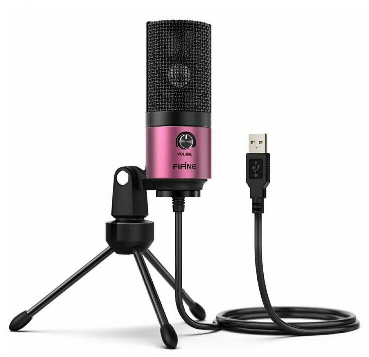 Микрофон FIFINE K669 (розовый, на штативе, USB 5V, 20Hz-20kHz, -34dB±30% (1kHz), S/N 78dB, шнур 1.8 м, рег. громкости)