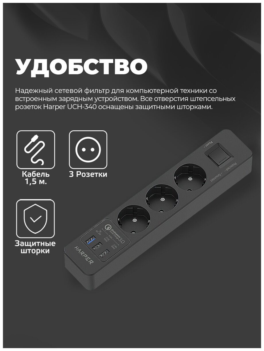 Сетевой фильтр с USB зарядкой HARPER UCH-340 QC3.0 / 3 розетки / 3 USB-порта / черный 2 608 ₽