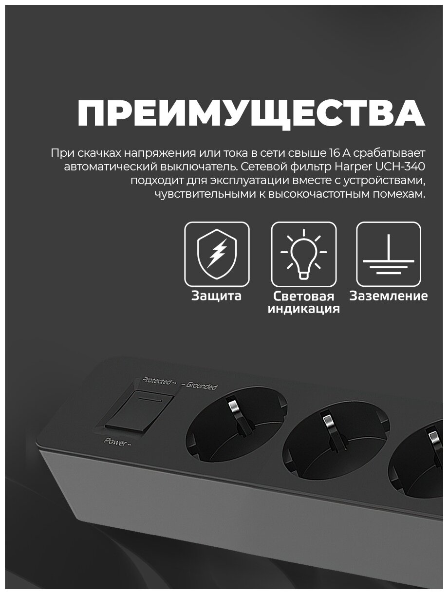 Сетевой фильтр HARPER UCH-340, 3 розетки, 1.5 м, с/з, 16А / 4000 Вт черный 2 279 ₽