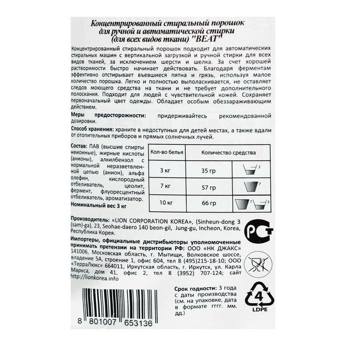 Стиральный порошок CJ Lion Beat для ручной и автоматической стирки, 3 кг./В упаковке шт: 1 информация: