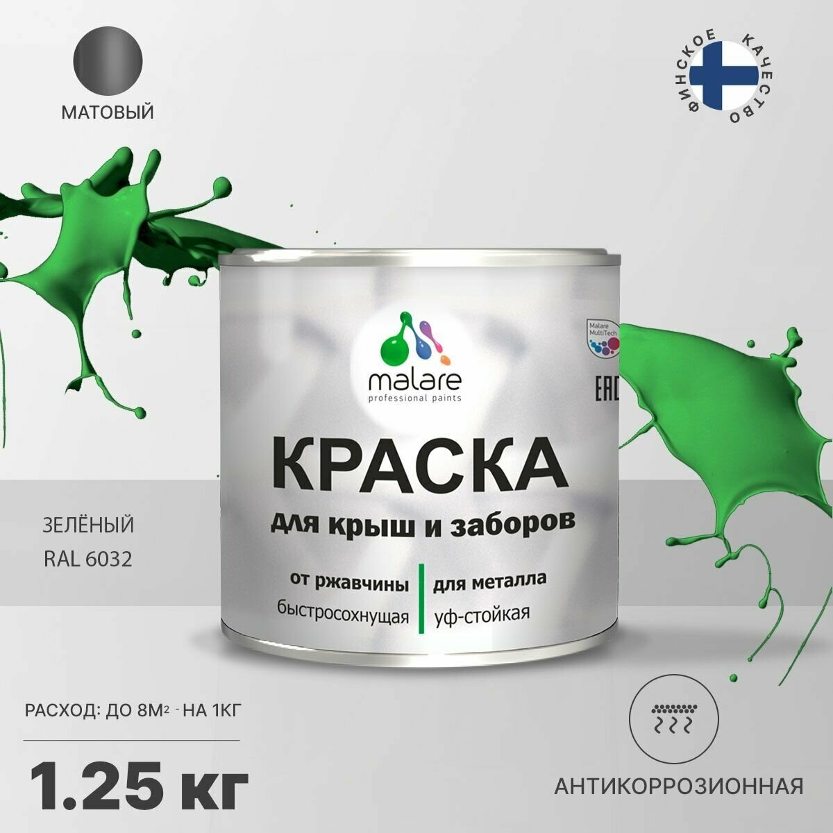 Краска Malare для металлического забора, для крыши из металла, для металлочерепицы, антикоррозионная, матовый, зеленый, 1,25 кг. информация: