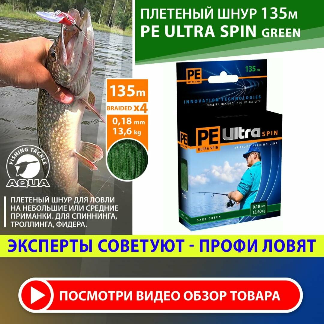 10 цен на Плетеный шнур для рыбалки AQUA PE ULTRA SPIN x4 Dark Green 135m 0.18mm 13.6kg / плетенка на спиннинг, троллинг, фидер