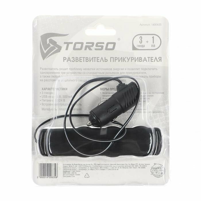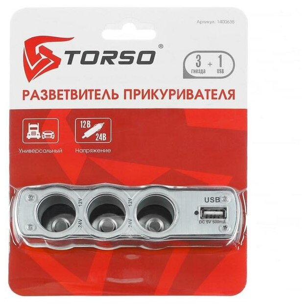 Разветвитель прикуривателя TORSO, 3 гнезда + USB, 12/24 В./В упаковке шт: 1 информация: